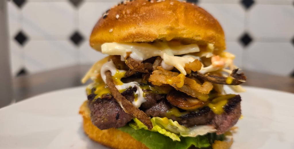 mit australischem Rindersteak, Champignons, Röstzwiebeln, Senf Aioli und Cole Slaw (A,B,D,E,1,2,11,,13,16,17,21)